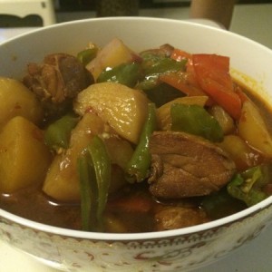 倒入适量清水,直至淹没食材。大火烧开,小火慢炖40分钟,直至鸡块软烂,加入青红椒,收汁出锅(留汤汁拌面)