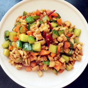 油热爆香葱花、辣椒,倒入鸡丁翻炒,下黄瓜丁、胡萝卜丁、花生,加少量老抽、生抽、糖、盐、鸡精,大火翻炒后勾芡出锅。