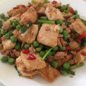 豌豆粒清洗干净沥干水备用;嫩豆腐切块放盘子里静置一会儿,让它渗出多余的水份,倒掉渗出的水,方便煎豆腐时不会因为水份过多溅太多油星子; 锅中加油烧热,放入豆腐块慢慢煎;