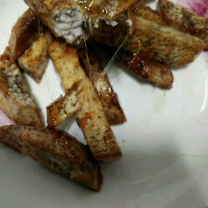 锅中留油放适量的糖煮溶再放炸好的芋头放下去