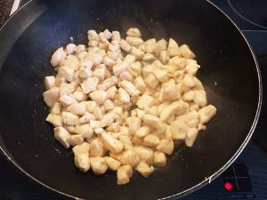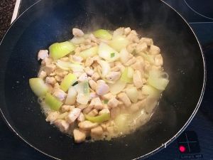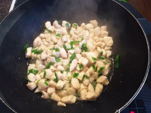 热锅冷油 倒入鸡丁翻炒至金黄