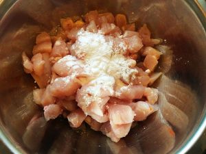鸡肉切丁用生粉 料酒和黑胡椒碎拌匀