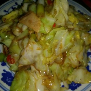 1-油锅烧热,放入鲜肉片或肉末,也可用腊肉 。出油后加入小米椒(圈状),大蒜叶或大蒜子翻炒一下,放入包菜翻炒受热