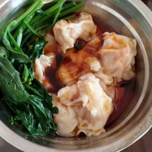 清水煮,浮起来即可。红油加蚝油热锅后加入