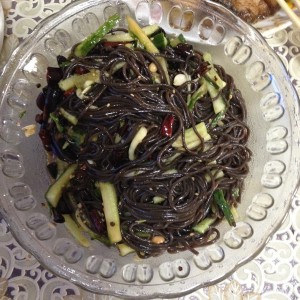 黄瓜切丝装碗垫底,捞出蕨根粉放上面