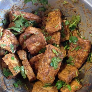 最后把烧烤酱、泄好的臭豆腐、过油蒜蓉酱、香菜一拌,OK了,就是如此简单!