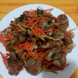 锅里放入少许油把炸好的里脊肉,切丝的姜胡萝卜香菜放入锅里炒制30秒左右放入调好的白糖和米醋炒制30秒勾芡出锅