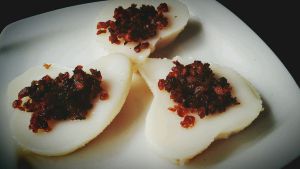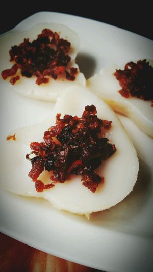 把豆糕粿从模具里拿出来,放在菜脯粒,完成任务了!我们这里卖这个的是专门用竹子做出来一根扁扁的竹签,就像庙里求签的那些竹签,然后就用它把豆糕粿从模具里刮出来,但是我没有这个,我只用了小小的牙签沿着模具里的边缘把豆糕粿拿出来!