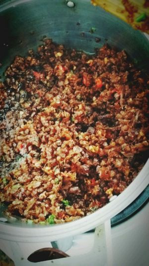 【菜脯粒】这是潮汕特有的一种风味,其实就是萝卜干剁碎之后的样子!这个可以事先先用油炒到颜色由浅变深,油要放多点哦,不然炒出来会感觉很干,这里我放了点葱花还有辣椒末一起下去爆香,还加了我们潮汕特有的鹅油!味道就更有街头买的感觉了。。。