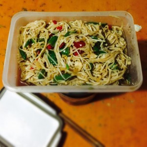 家里没有黄瓜或胡萝卜,我就用了青椒和红椒代替,加了点蒜