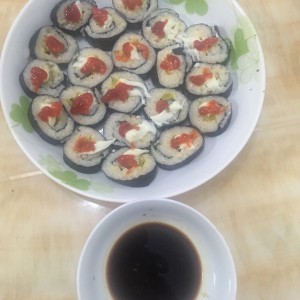 根据个人口味加强沙拉酱,番茄酱,鱼子酱,反正你觉得怎么样好吃怎么样加,旁边配上酱油芥末,再泡上一杯茶,可以开吃啦