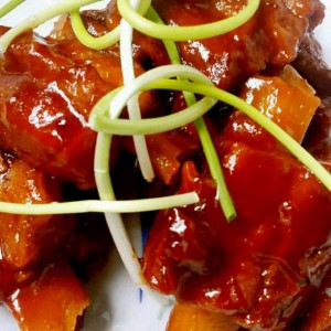 排骨炒熟了,在放入调好的糖醋汁,烩两分钟入味,在倒入开水,水要末过排骨,慢慢煮到收汁就好了,可以加少量的盐。