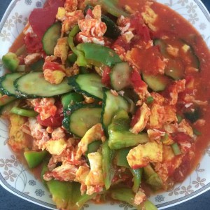 用锅中底油把西红柿炒出汁,放半勺糖。加入青椒和黄瓜,翻炒一分钟;加入鸡蛋再翻炒一分钟。