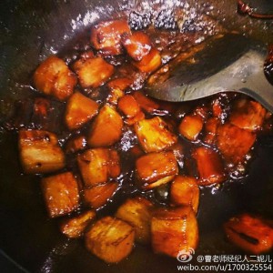 糖溶化了就放肉进去,不停翻炒,直到肉上裹了一层厚糖而且变成棕黄色糖色就挂上了。