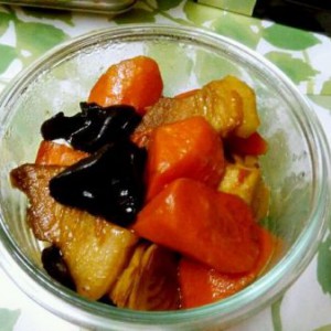 半小时后加入胡萝卜春笋黑木耳,一勺盐,一勺老抽,一勺生抽,焖20分钟就可以出锅~
