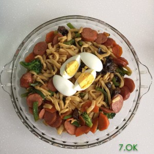 在准备配菜的同时要先将面条煮好 用凉水镇着 用凉水镇着的面条不会粘黏 然后 热锅 加少许油(炒面油大不好吃) 先炒葱和香肠 待炒出香肠味道时再下配菜 (下配菜时要先下没焯过的菜 最后下焯过的菜) 配菜都翻炒均匀后加作料(五香粉 盐 鸡精 生抽)放入淋干的面条简单翻炒上色之后就可以起锅了