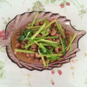 把凉下来的花生捞出装盘,放上备用芹菜,洒上麻油。凉拌花生完成。