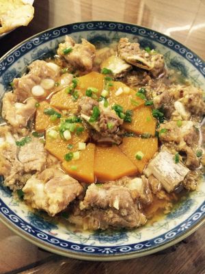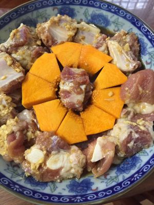 4.上锅蒸20分钟。撒上葱花再蒸1分钟就可以出锅啦。排骨的香味和南瓜的甜味融为一体,口感可是赞赞滴。