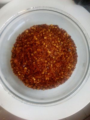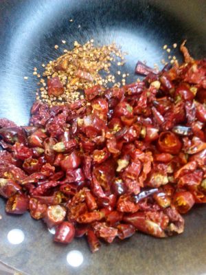 锅里加一点点油,为了不呛人。用微火不停翻炒,感觉辣椒快糊了的时候关火,用余温继续翻炒。等温度降下来再开微火翻炒,温度高的时候再关火,用余温翻炒。反复开火关火3次,辣椒和辣椒籽都分开,翻炒时沙沙响就可以关火。