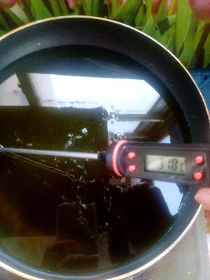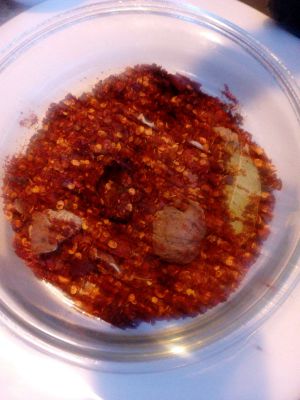 油温降到170,将油倒入辣椒面中,一边倒一边搅拌,油没过辣椒面的时候停止加油。等油温降到150度,把剩余油倒入辣椒面。加盖放通风处,密闭一天即可。