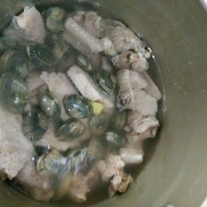 洗净的排骨放入高压锅,加入花蛤、姜,水没过排骨就行,盖锅盖炖大约半小时。
