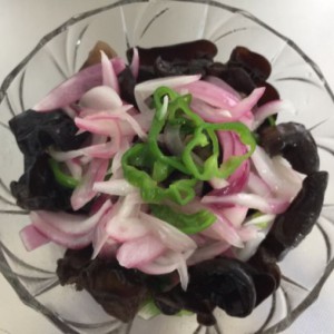 泡发好黑木耳 ,洗净 。洋葱切丝 。青椒切丝