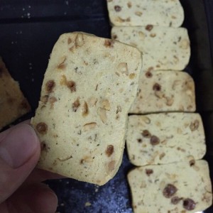 冷藏后取出,用刀切成饼干造型(厚度保持一致,0.5cm左右),摆到垫了油纸的烤盘中(面片摊开,之间留点空隙,以防饼干膨胀粘在一起)。