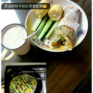 我是晚上做的为了以后当早饭吃,所以这些葱油饼在烤的时候都是为了定型而已,没有完全烤透,烤完之后待冷却,一个一个叠放在盘子,放冰箱冷冻室,想吃的时候就拿一个出来烤,然后放各种想吃的料,哈哈,非常方便省事,早饭分分钟解决