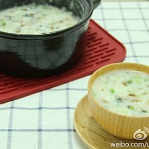 大米煮40分钟左右,放入皮蛋和肉丁,大火煮沸,用勺子搅拌,加剩下的半勺盐,调小火再煮5分钟左右关火,散香葱末即可。