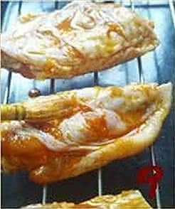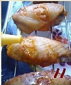 将鸡翅摆到烤架上,把剩余的料汁再重新刷到鸡翅上;