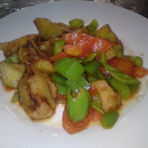 茄子削皮切滚刀块,青椒西红柿切块备用
