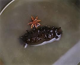 另做一锅鸡汤放入一个大料瓣,将海参略煮关火沁入味出锅,千万不要煮的时间过长。