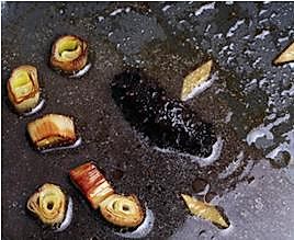 锅烧热,放入油、将葱段炸黄,制成葱油。