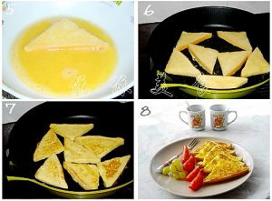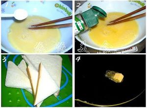把切成三角形的方包放进蛋液中,正反两面蘸上鸡蛋液;
