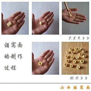 等锅里的水再次烧开,锅里的酒窝面全部浮在水面,用漏勺将面沥水捞出。