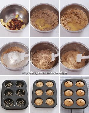 (黄油室温足够软化,鸡蛋也要室温放置)黄油加红糖打匀,分次加入提前打匀的蛋液,打至蓬发的状态。很多人打发黄油和鸡蛋时经常会出现油水分离的情况。这大多是由于黄油不够软化,鸡蛋太冷造成的问题。