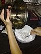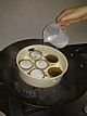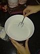 将余下之1.5杯水煮沸,加入砂糖或红糖煮溶,趁热撞入粉浆中,搅成滑粉浆