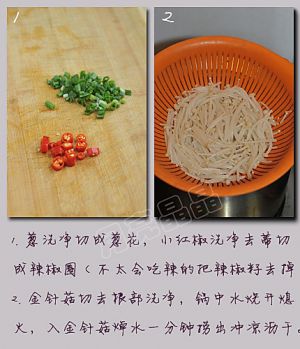 金针菇洗净切去根部洗净,锅中水烧开熄火,入金针菇焯水一分钟,捞出沥干水份。