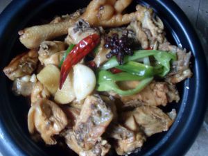 炒锅上火入油烧热,把生姜,蒜头,小葱稍微炸一下,加入八角 当归 桂皮的同时 放入鸡块,炒干水分至香味欲出(加入白糖炒至金黄色)喷入料酒,生抽炒拌上色 ,加半勺高汤烧开,到人电饭锅