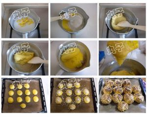 等到面团变得华润后,就将剩下的蛋液,一点儿一点儿的加入到面团中,每加一次都要充分搅拌均匀,直至面团的软硬度,是舀起面糊时可以慢慢流下,在橡皮刮刀上形成倒三角的状态即可;