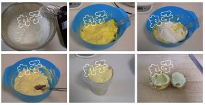 将4的面团放到盆中,先加入1/4的蛋液,用橡皮刮刀迅速混合均匀;(第一次开始加蛋液的时候要多加点儿,如果太少,蛋液会被面团的余热弄熟)