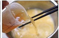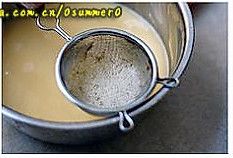 用细致的漏勺过滤蛋液,倒入容器里。用勺子把蛋液表面的气泡除去,一定要除的干净蒸出来才漂亮。如果容器本身没有盖子,那就要用高温保鲜膜或者盘子盖着再蒸。