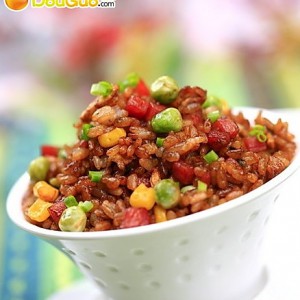 倒入酱油翻炒均匀。让每一粒米饭都成酱红色