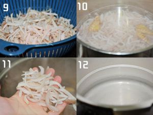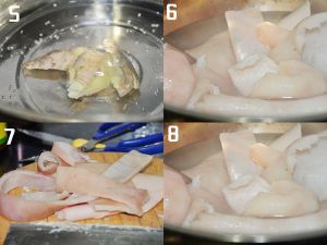 加入姜块,将水煮热。焯洗猪皮,再沥水备用。猪皮里外再次刮干净。再进行二次的温水焯洗