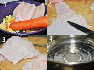 备齐所有材料。猪皮用刀刮去多余的油脂。刮去油脂备用。汤锅加水。