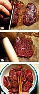 牛柳逆纹切片,约1厘米厚。放一片在砧板上,以松肉锤(或刀背)敲薄两面,其余照做,放在碗内加水2汤匙拌匀,搁置至水分为牛肉吸收,再拌入蛋白,冷藏待用。