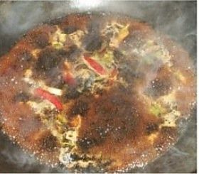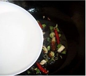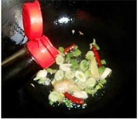 锅内倒油后将葱姜蒜红椒放入爆香。