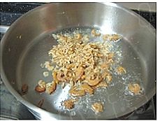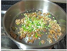 锅内留少量油,爆香虾皮与虾米,之后放入葱花一起炒出味。