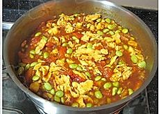 把炒好的鸡蛋放入,再放番茄酱,少量清水盖上锅盖,焖十分钟。