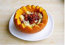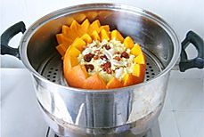 将小米饭、红枣、百合、枸杞拌匀,放入南瓜中